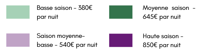Pour en savoir plus, veuillez consulter notre calendrier des prix ci-dessous, puis faites votre demande de réservation via le formulaire de demande, afin de vérifier les disponibilités.